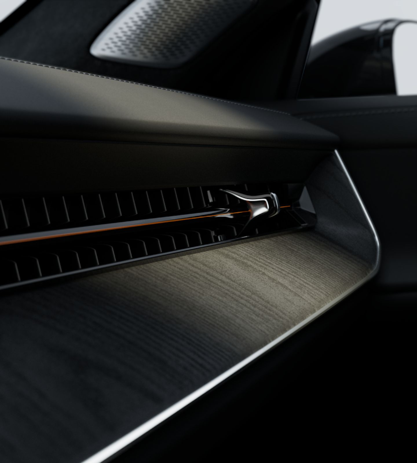 Black ash deco gains its distinctive finish through treatment and staining, which preserves the physical pattern of the wood. This process means that each piece becomes unique to the Polestar 5 its paired with.