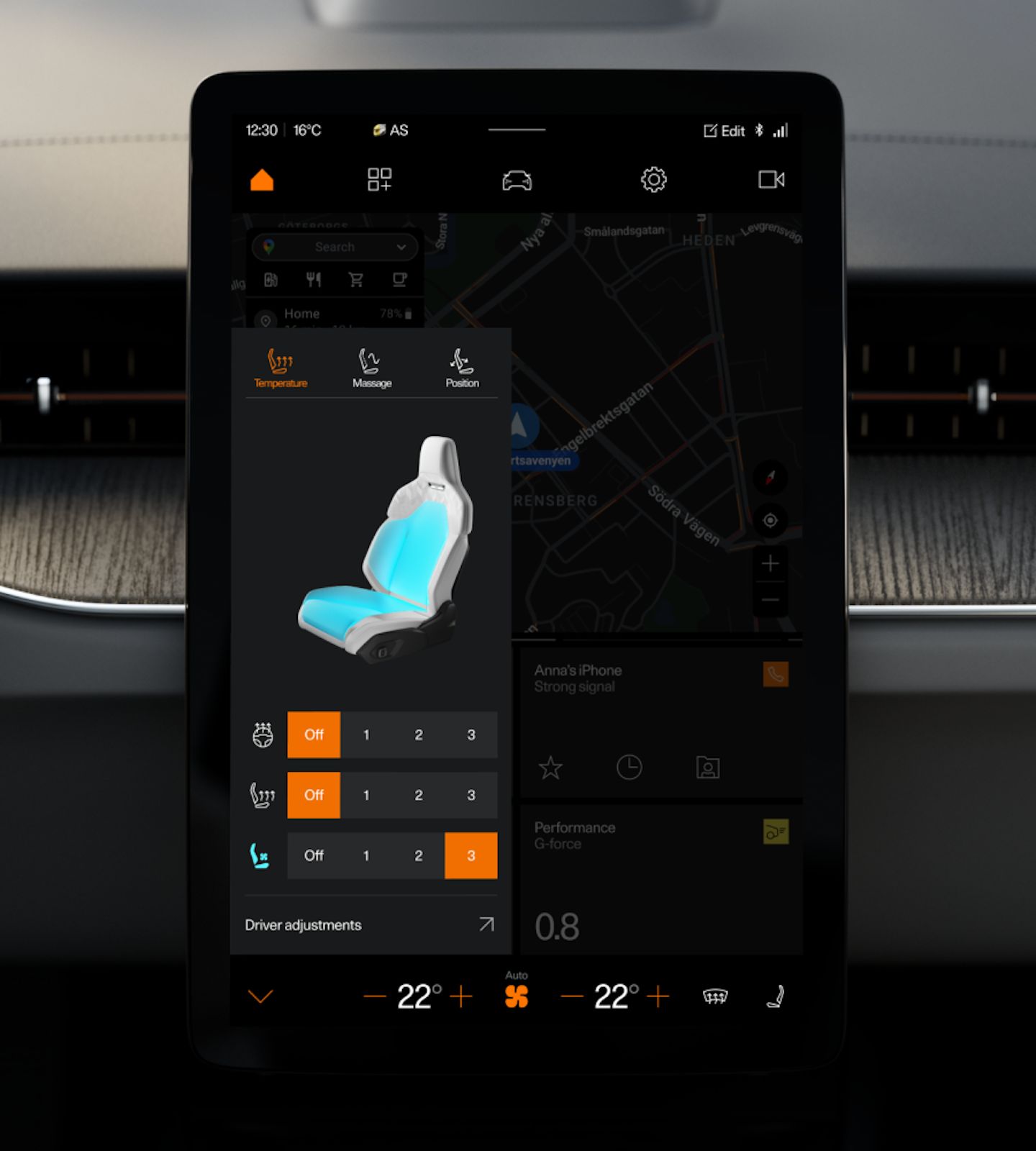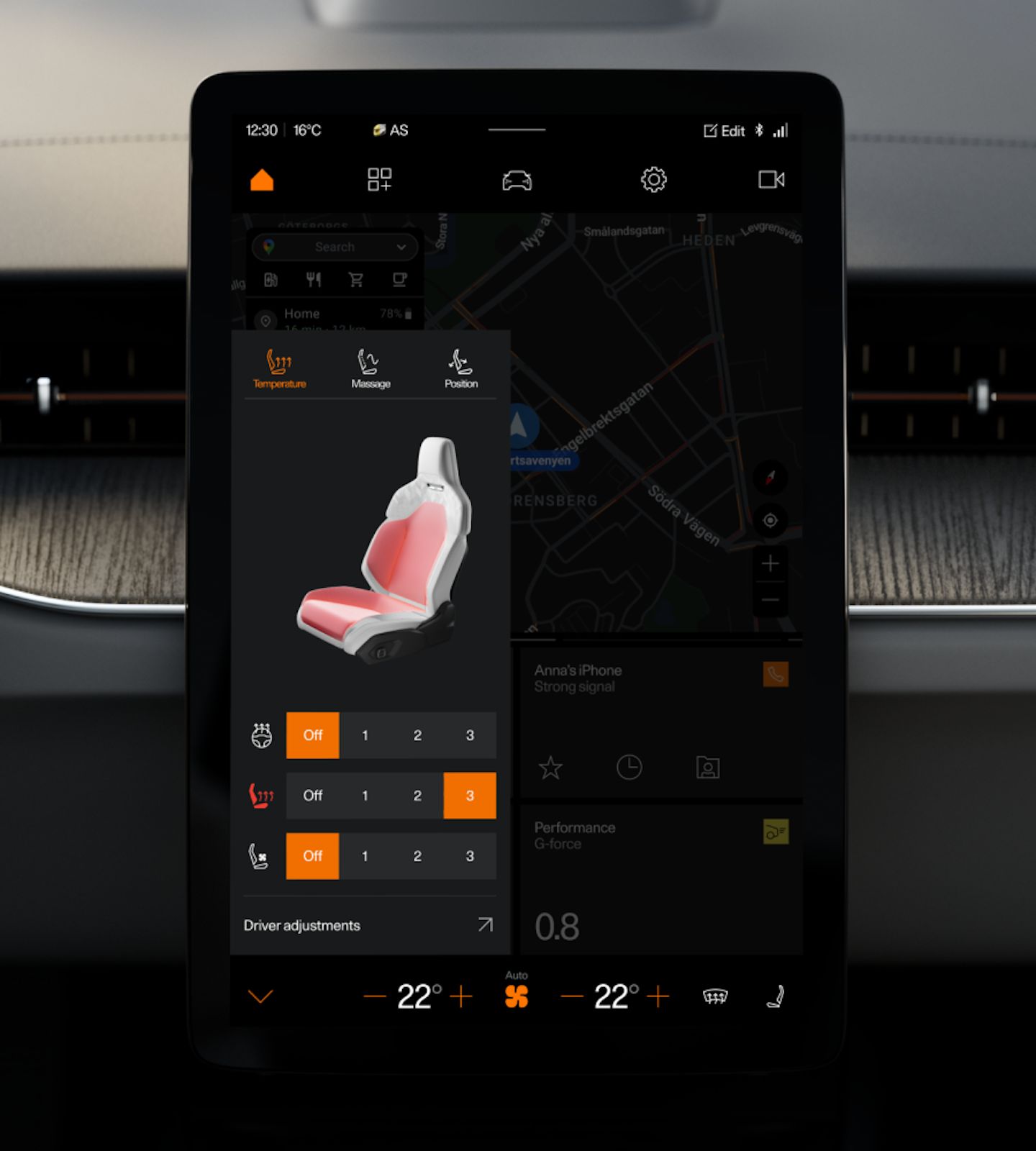 The ambience is in the details, such as the minimalist white or Swedish gold LED interior lighting. It’s integrated into the instrument panel and the door sides to highlight and enhance the interior design.